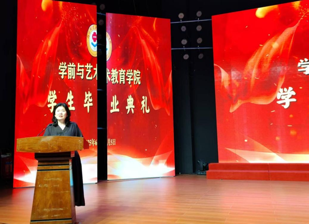 表彰仪式结束,张丽经理走上发言台。她以饱含深情的话语,回顾了同学们在校期间的成长历程。“时光如白驹过隙,校园的每一处角落都留下了你们青春奋斗的印记。” 经理感慨道。致辞最后,她寄语毕业生:“希望同学们以坚定的信念和无畏的勇气,在未来的道路上奋勇前行,在广阔的天地间绽放属于自己的光芒。愿你们永葆初心,归来仍是少年。” 真挚的话语引发全场师生的强烈共鸣。