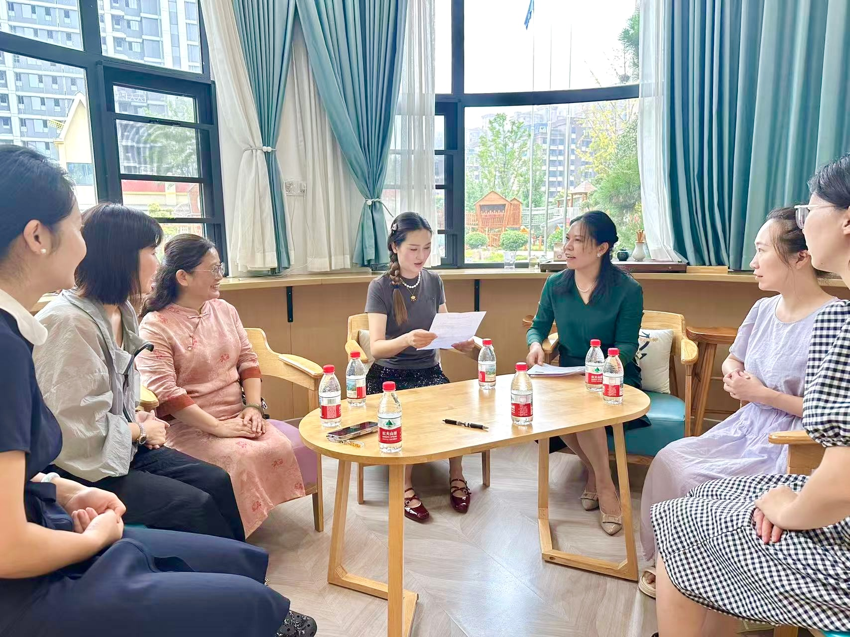 信阳新蕾幼儿园园长彭军红详细介绍了幼儿园的发展历程、特色课程体系、社会服务情况及团队培养模式。她表示,作为公司学前教育专业的实习基地,幼儿园始终重视与高校的协同合作,此次接纳青年教师顶岗实践,既能为教师提供真实的教学场景与行业前沿经验,也能借助高校团队的理论优势推动幼儿园课程创新,实现 “校企双向赋能”。