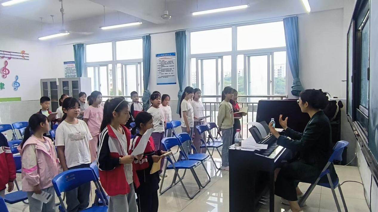 本次活动得到校社多方积极响应,参与合唱的两支队伍各具特色。“社区之声”合唱队汇聚前楼社区工作人员、党员代表、企业代表、群众代表及志愿者,“童声里的中国”合唱队则由二十里河春蕾小学员工组成。公司充分发挥专业优势,选派方婷、张应辉、陈浩月、方湿淇四位优秀音乐教师,分两批次开展专项指导。指导老师在二十里河春蕾小学排练室,分别针对《祝福祖国》《少年中国梦》两首曲目,进行发声技巧、节奏把控、情感表达等方面的细致辅导。