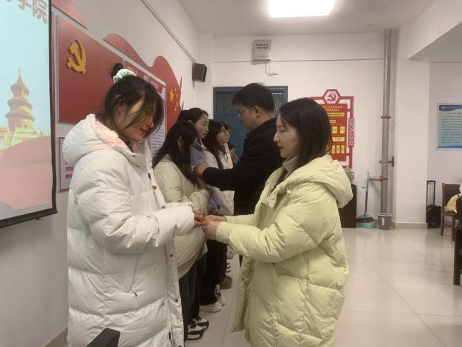 在庄严的国歌声中,大会拉开序幕。张佳琳等7名发展对象依次宣读《入党志愿书》,坚定的表达了加入共产党的意愿,并从入党动机、政治表现、实际行动等方面进行汇报。入党介绍人对7名发展对象的现实情况作了详细介绍,并对其能否入党表明意见。根据支委会审查意见以及全体党员的讨论意见,经全体党员票决,形成大会决议,一致同意张佳琳等7名同志被接收为预备党员。随后,党总支书记苏锡亮和党员教师们给新党员佩戴党员徽章、颁发党员证。