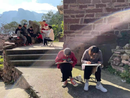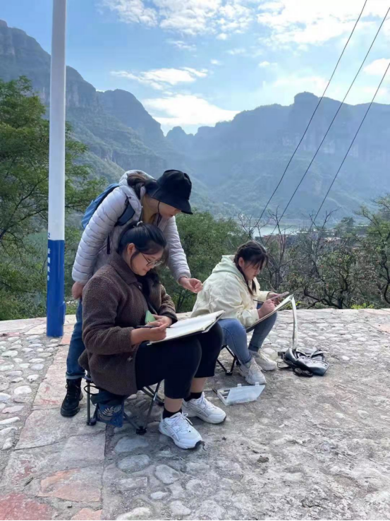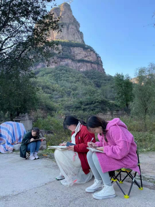 在一周的实践教学活动中,师生们以王相岩景区为中心,向周围陆续探索了草庙、东湾、西乡坪村等太行山一些土生土长的传统古村落。同学们穿梭于石板老房之间,行走于大山流水之畔,步行于新奇古意的小镇;在现实与意识之间进行梦幻联动,于时空的彼岸遥望远方,体会那古老情丝,抒发内心激荡的意境。长亭里,古道边,石板上,溪流畔……处处是生活的缩影,处处是艺术的体现。同学们在这里,擦出了现实与艺术的火花,碰出了情感与流年的光影,一幅幅灵动巧然的画作跃然纸上,无不体现老师与员工们的精湛技艺。