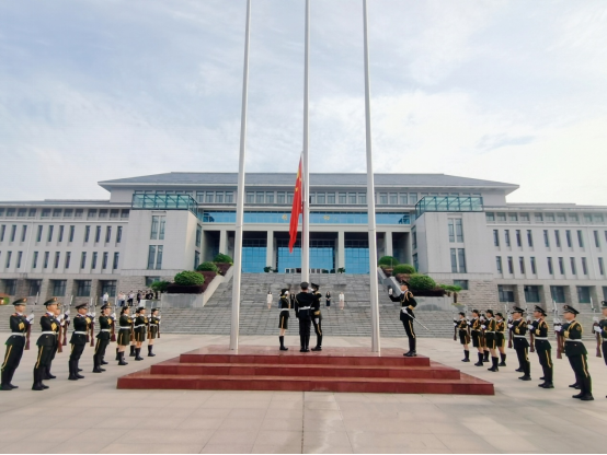 早上7点开始,国旗护卫队踏着鼓乐声将鲜艳的五星红旗护送至升旗台,伴随着雄壮的国歌,五星红旗迎着朝阳,沐浴着晨曦冉冉升起。