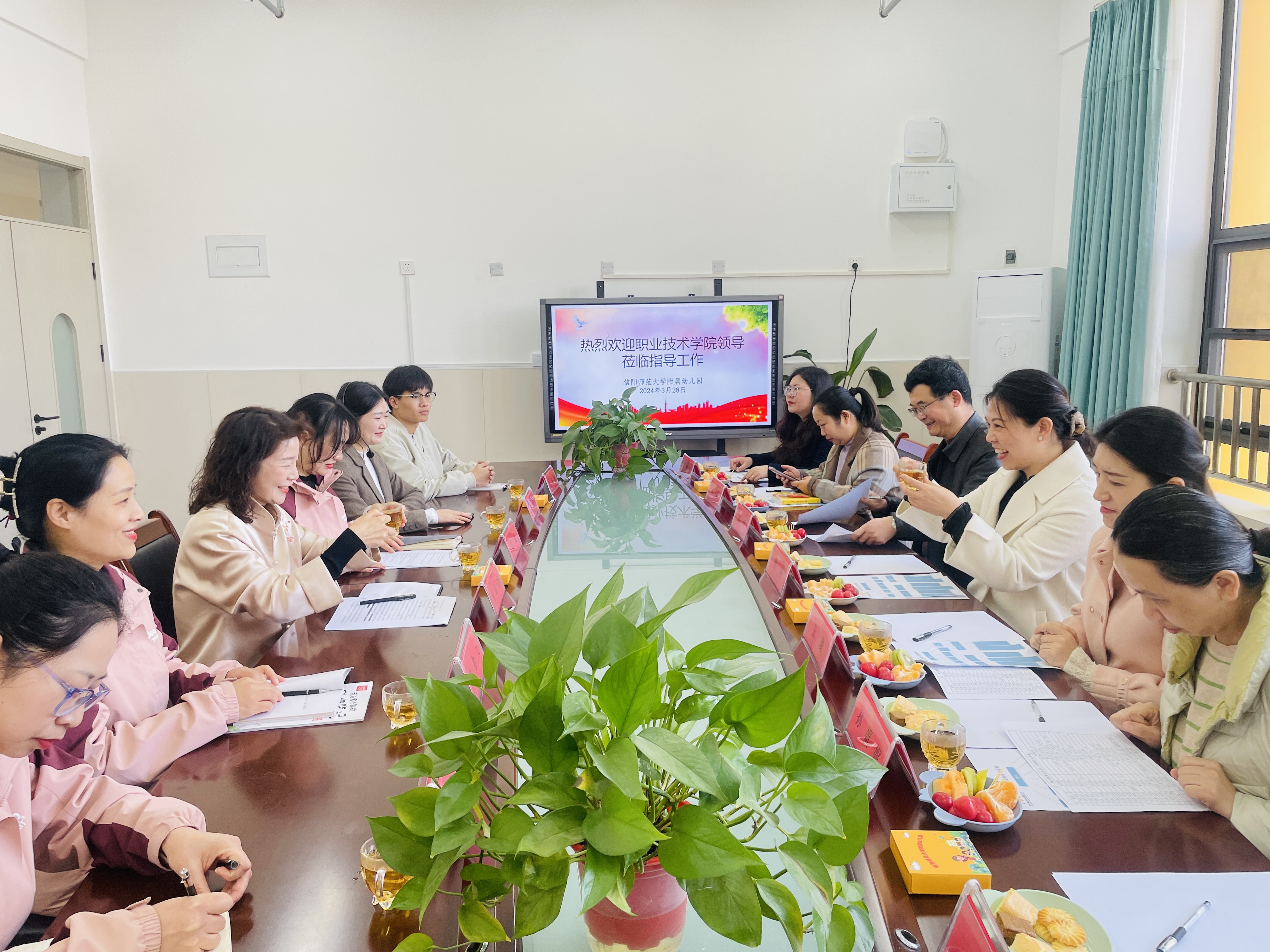 第三站2024年3月29日。304永利集团经理张丽、副经理闻刚、王璐、实训室主任姬会会、教务办主任冉冉、学前教育教研室主任孙娓娓、骨干教师李楠一行来到有40年办园历史的信阳师范大学附属幼儿园。