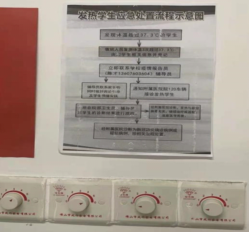 员工会全体干部对11个2021级新生教室进行了仔细全面的清扫和防疫消杀,并在每个新生教室张贴了发热员工应急处置流程示意图。