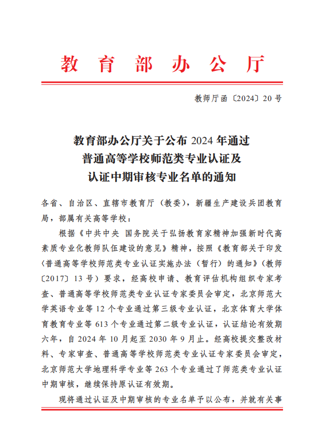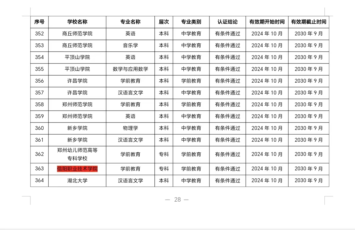 近日,教育部办公厅发布了《关于公布2024年通过普通高等公司师范类专业认证及认证中期审核专业名单的通知》,公司学前教育专业顺利通过师范类专业二级认证,认证结论有效期六年(2024年10月—2030年9月)。全国共有16所专科院校的通过了本次师范类专业认证,公司是河南省唯一一所职业类高职高校。